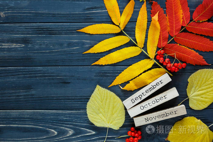 五颜六色的秋天叶子 黄色和红色谎言在灰色木制的背景旁边木酒吧以月份名字 9月 10月 12月 秋天 季节变动概念照片 正版商用图片0sdkj1 摄图新视界